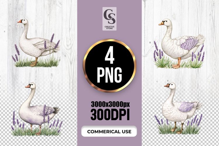 4 Watercolor Goose in Lavender Field Clipart Sublimation PNG Files Perfect for Greeting Cards, Invitations, Junk Journal, Party Decor, Scrapbooking and many other craft projects.