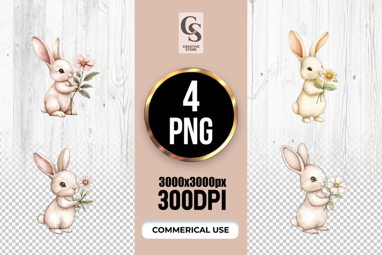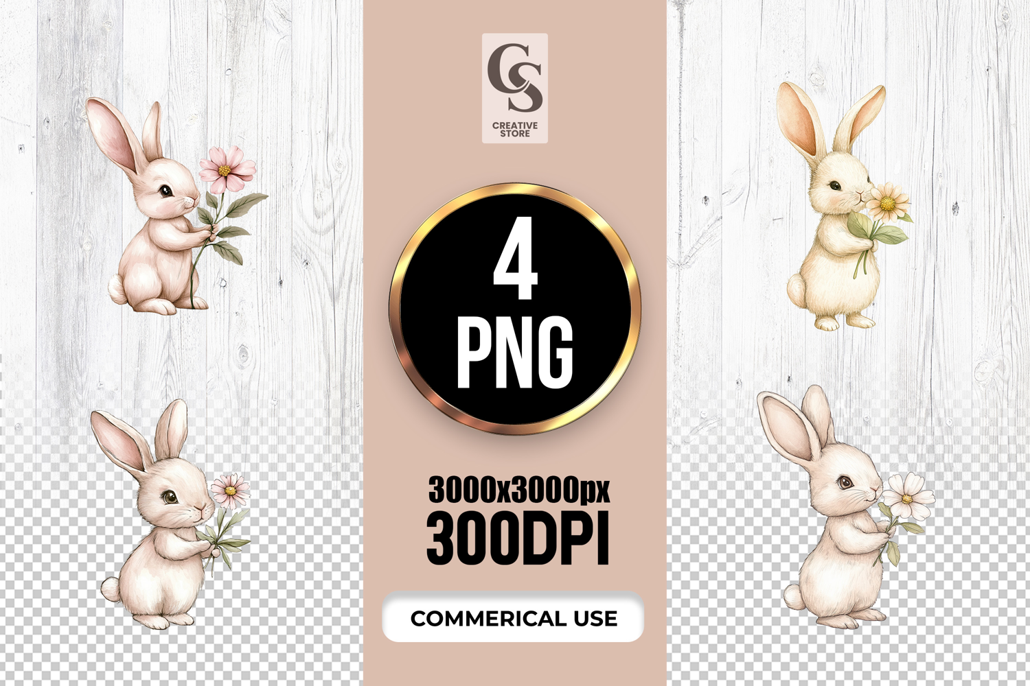 4 Watercolor Bunny Holding Flower Clipart Sublimation PNG Files Perfect for Greeting Cards, Invitations, Junk Journal, Party Decor, Scrapbooking and many other craft projects.