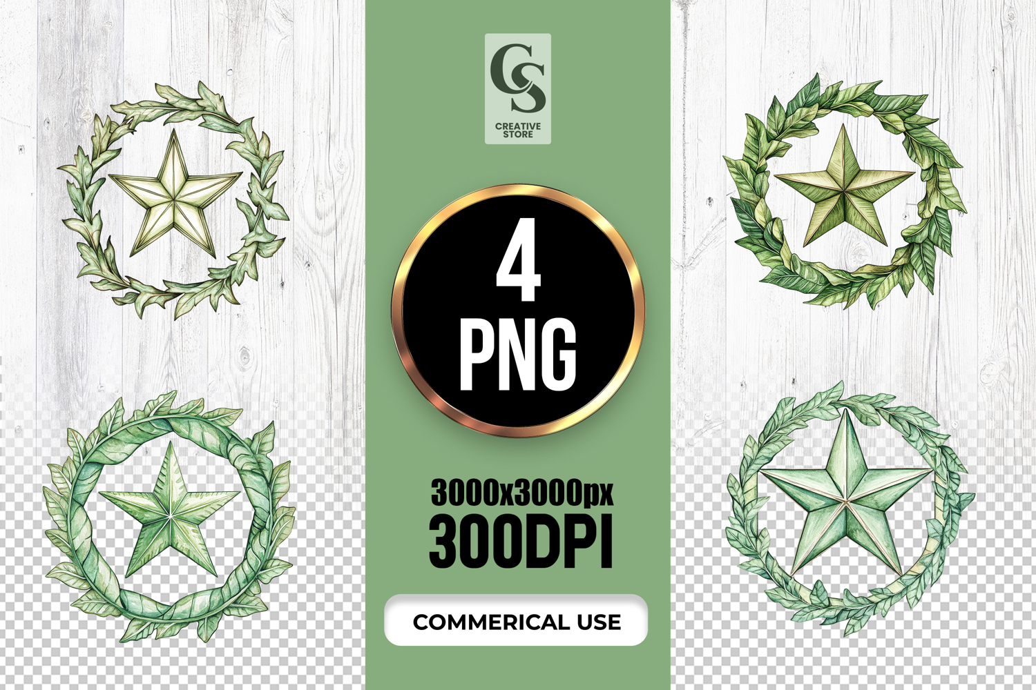 4 Green Leaf Wreath and Star Clipart Sublimation PNG Files Perfect for Greeting Cards, Invitations, Junk Journal, Party Decor, Scrapbooking and many other craft projects.