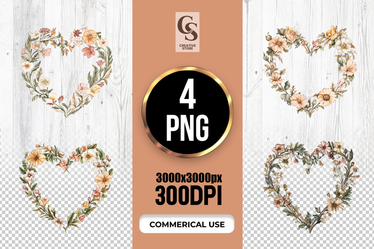 4 Floral Heart Frame Wreath Clipart Sublimation PNG Files Perfect for Greeting Cards, Invitations, Junk Journal, Party Decor, Scrapbooking and many other craft projects.