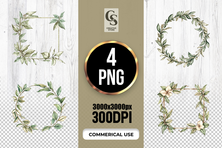 4 Watercolor Greenery Frame Clipart Sublimation PNG Files Perfect for Greeting Cards, Invitations, Junk Journal, Party Decor, Scrapbooking and many other craft projects.