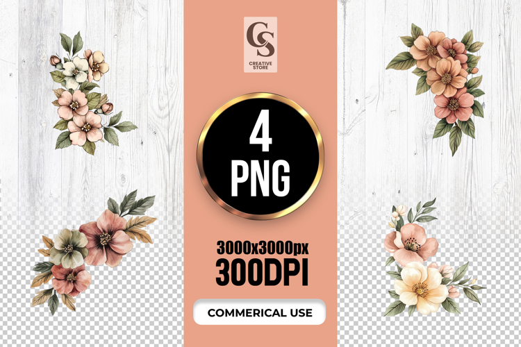 4 Watercolor Floral Corner Bouquet Clipart Sublimation PNG Files Perfect for Greeting Cards, Invitations, Junk Journal, Party Decor, Scrapbooking and many other craft projects.