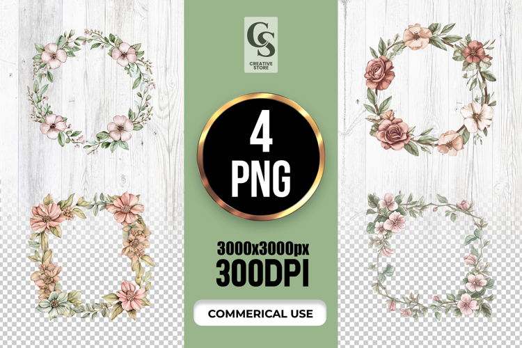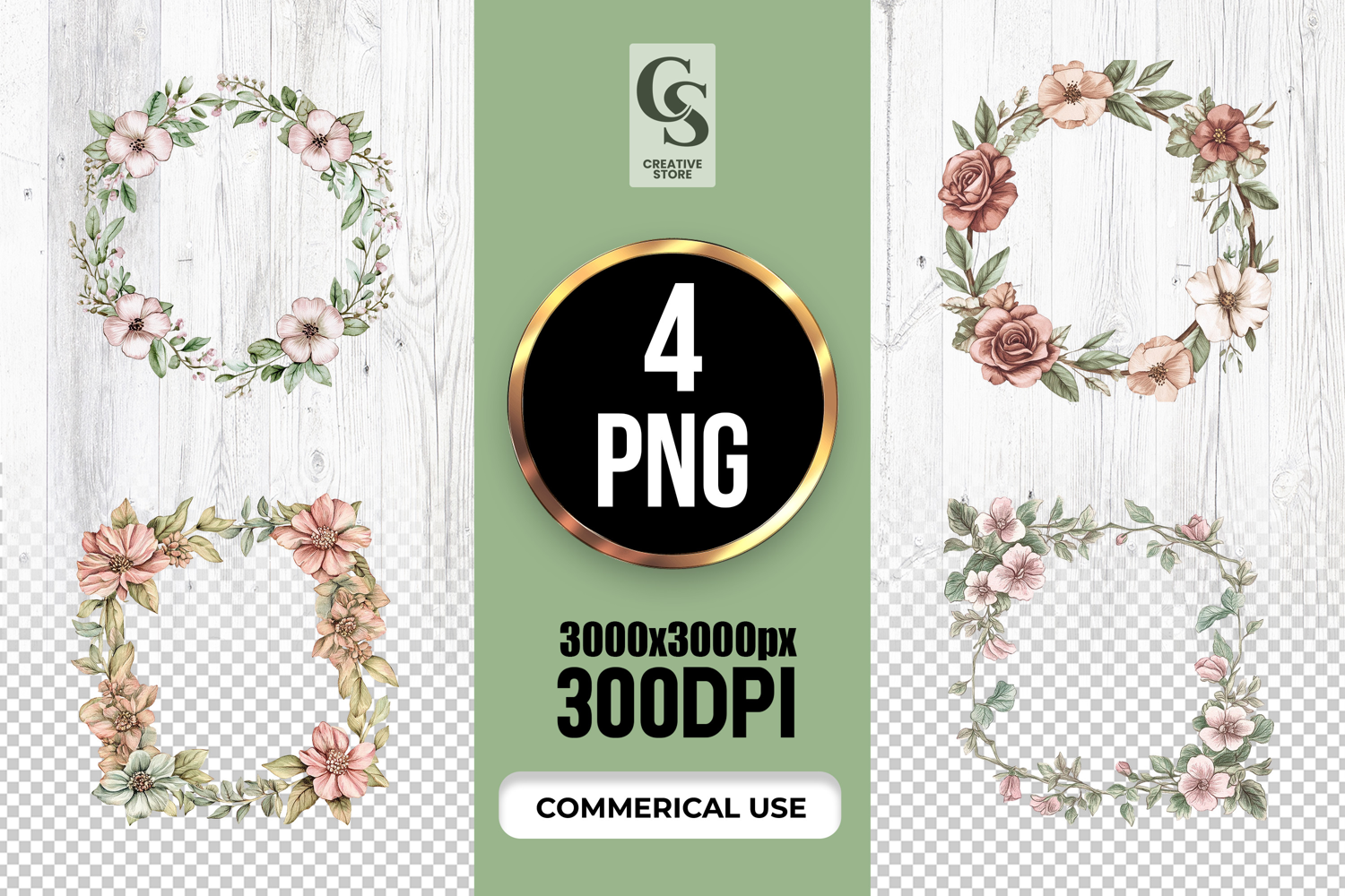 4 Watercolor Pink Floral Wreath Clipart Sublimation PNG Files Perfect for Greeting Cards, Invitations, Junk Journal, Party Decor, Scrapbooking and many other craft projects.