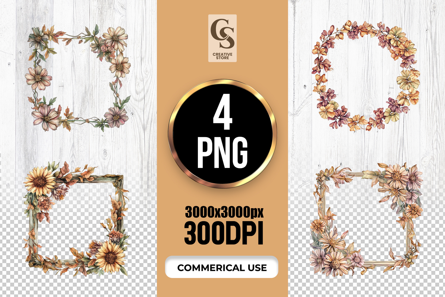 4 Watercolor Autumn Floral Frame Clipart Sublimation PNG Files Perfect for Greeting Cards, Invitations, Junk Journal, Party Decor, Scrapbooking and many other craft projects.