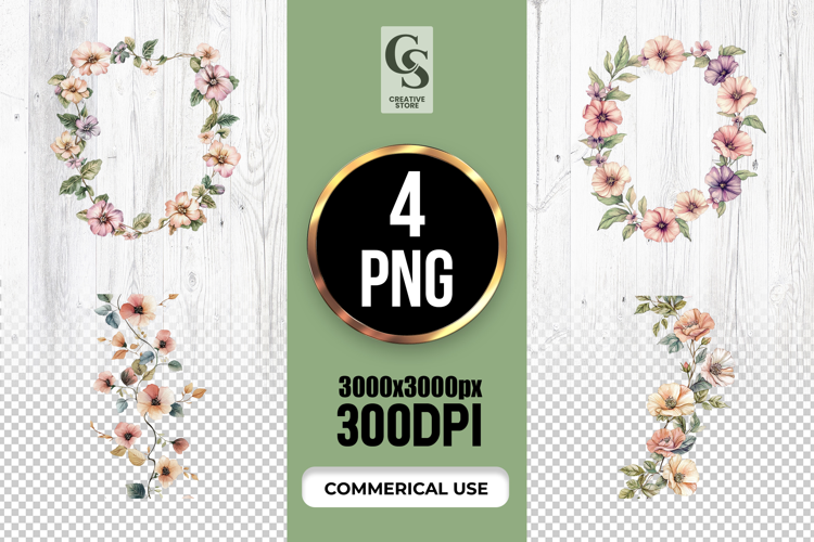 4 Watercolor Pastel Floral Wreath Clipart Sublimation PNG Files Perfect for Greeting Cards, Invitations, Junk Journal, Party Decor, Scrapbooking and many other craft projects.