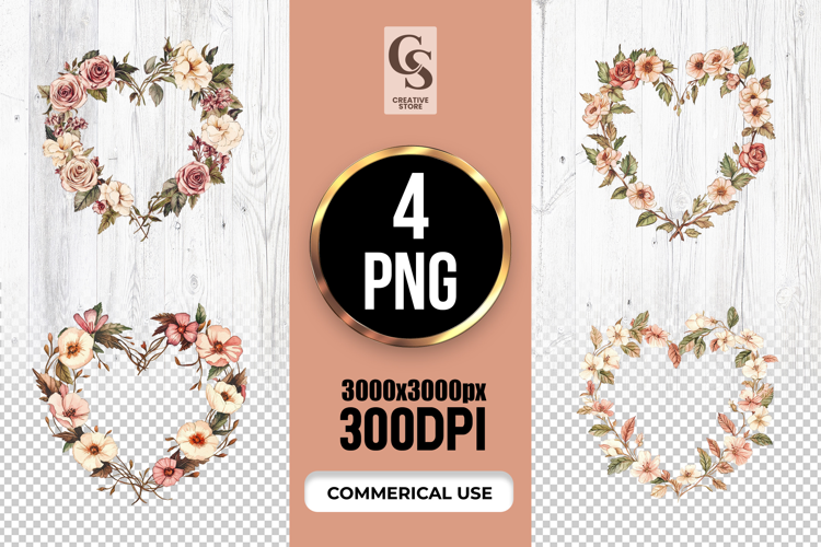 4 Vintage Rose Heart Wreath Clipart Sublimation PNG Files Perfect for Greeting Cards, Invitations, Junk Journal, Party Decor, Scrapbooking and many other craft projects.