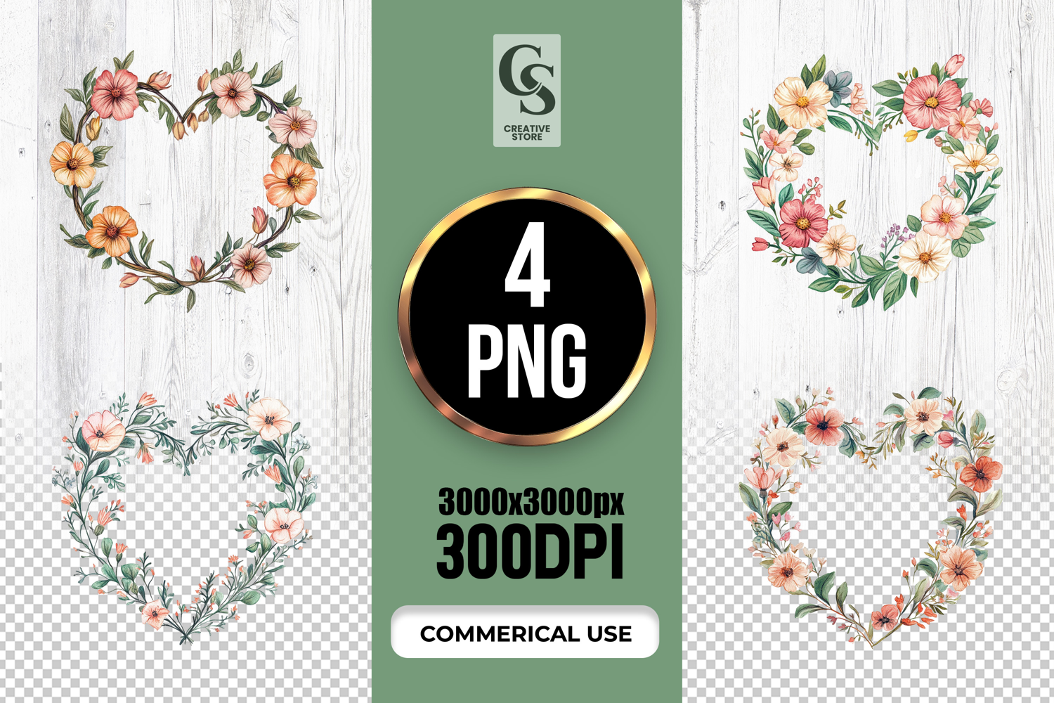4 Pastel Wildflower Heart Wreath Clipart Sublimation PNG Files Perfect for Greeting Cards, Invitations, Junk Journal, Party Decor, Scrapbooking and many other craft projects.