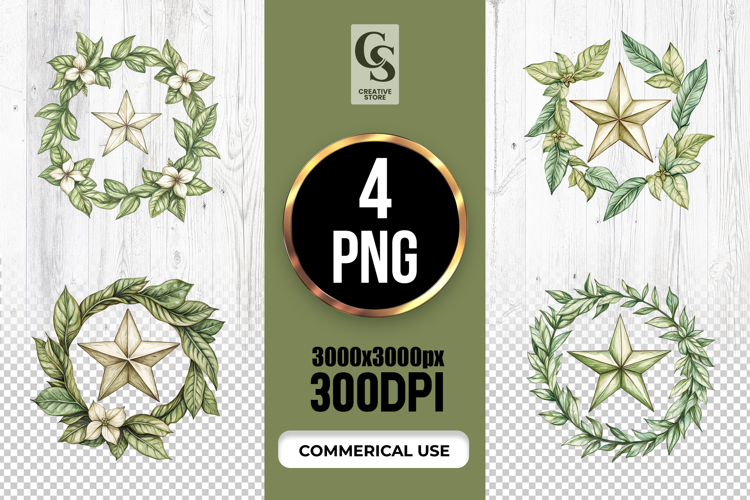 4 Greenery Star Wreath Clipart Sublimation PNG Files Perfect for Greeting Cards, Invitations, Junk Journal, Party Decor, Scrapbooking and many other craft projects.