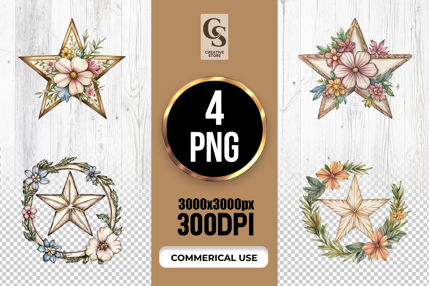 4 Floral Wooden Star Frame Clipart Sublimation PNG Files Perfect for Greeting Cards, Invitations, Junk Journal, Party Decor, Scrapbooking and many other craft projects.