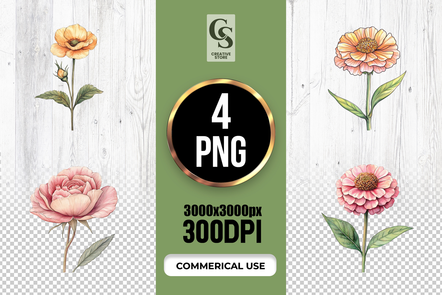 4 Vintage Botanical Flower Clipart Sublimation PNG Files Perfect for Greeting Cards, Invitations, Junk Journal, Party Decor, Scrapbooking and many other craft projects.