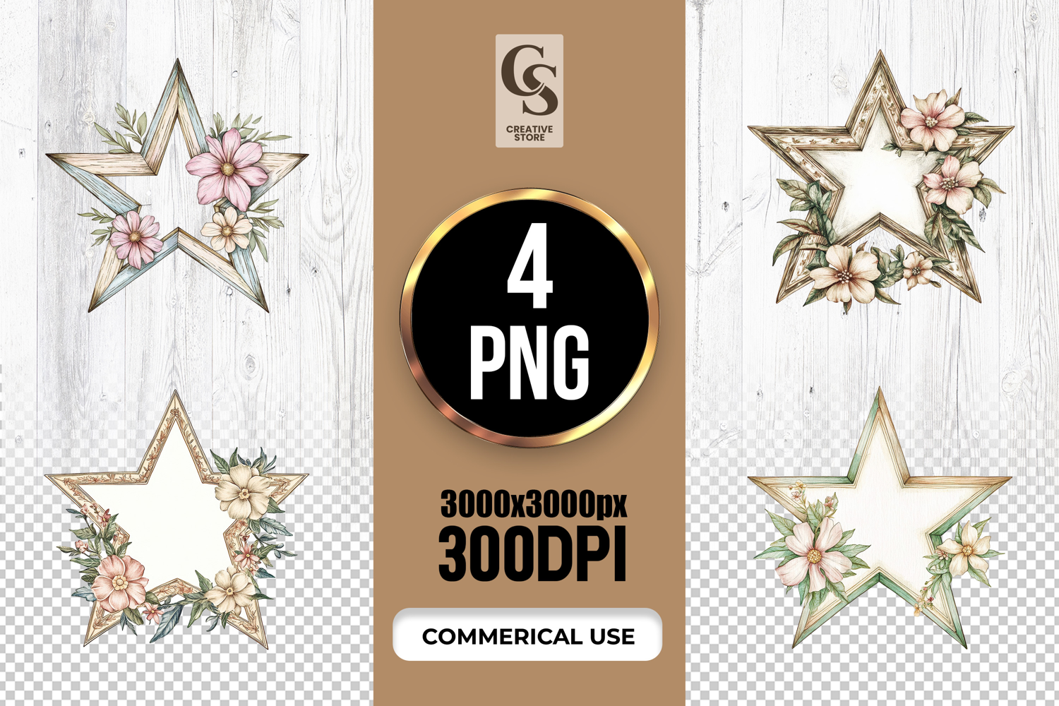 4 Vintage Floral Star Frame Clipart Sublimation PNG Files Perfect for Greeting Cards, Invitations, Junk Journal, Party Decor, Scrapbooking and many other craft projects.