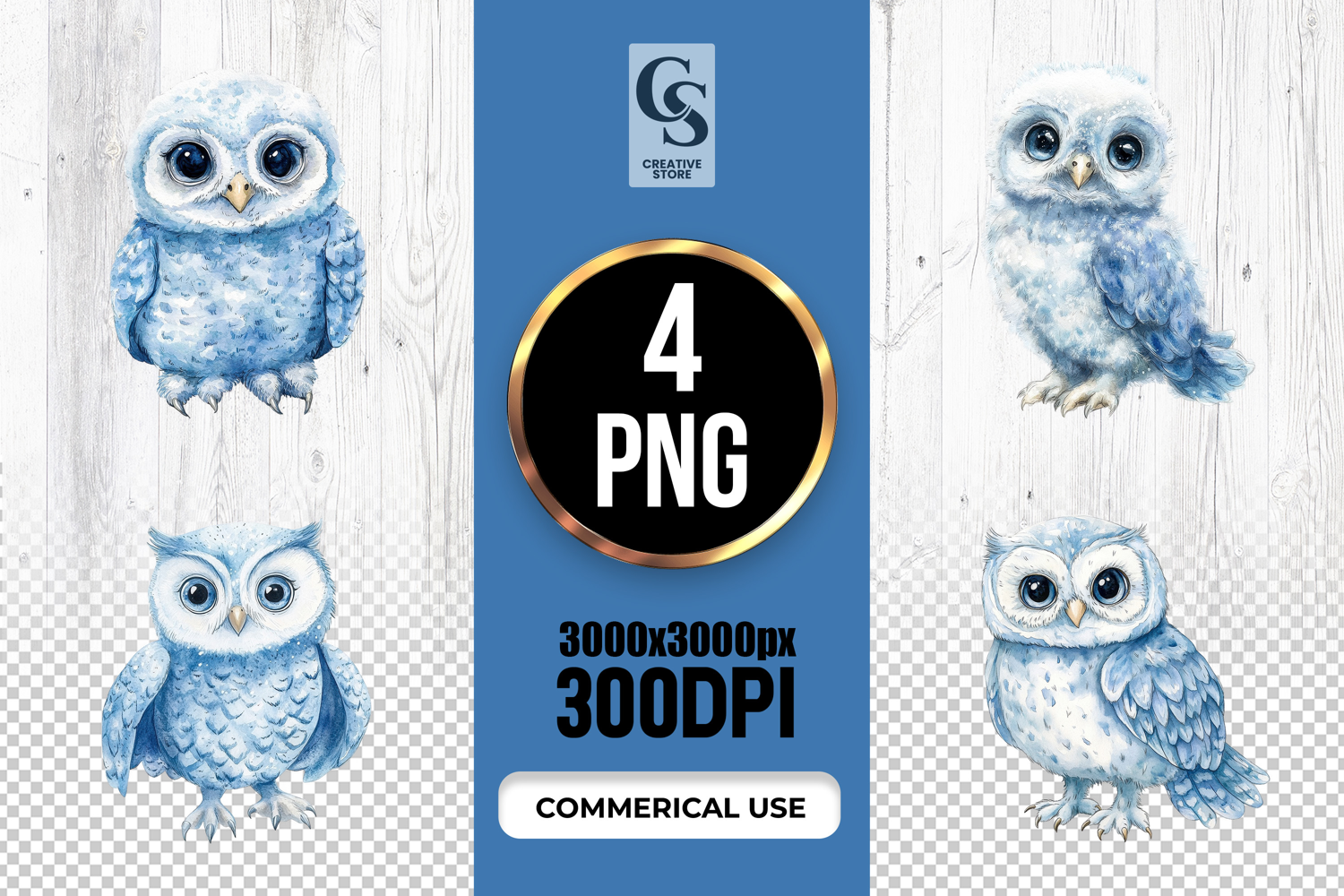 4 Cute Blue Owl Clipart Sublimation PNG Files Perfect for Greeting Cards, Invitations, Junk Journal, Party Decor, Scrapbooking and many other craft projects.