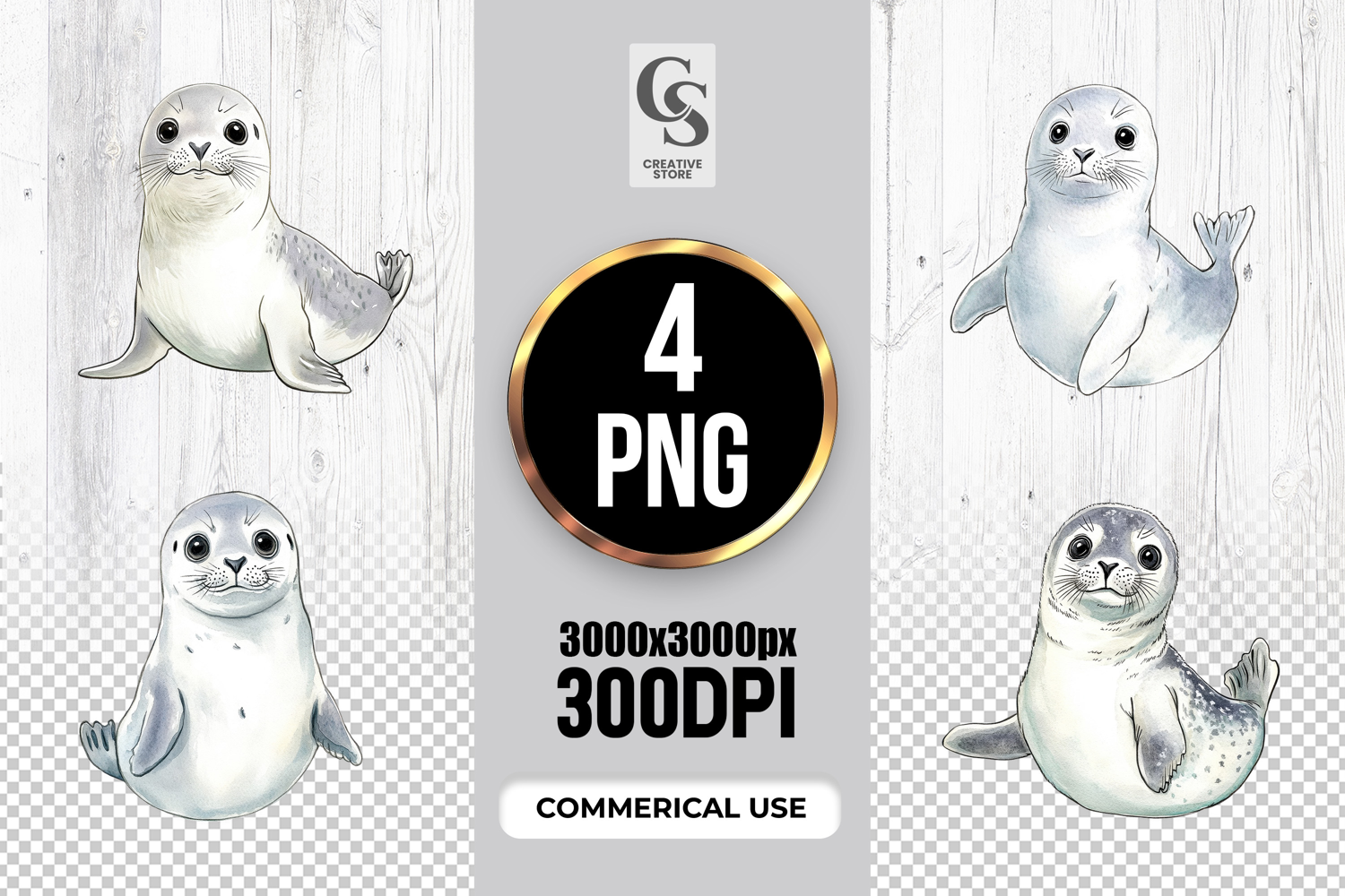 4 Cute Baby Seal Clipart Sublimation PNG Files Perfect for Greeting Cards, Invitations, Junk Journal, Party Decor, Scrapbooking and many other craft projects.