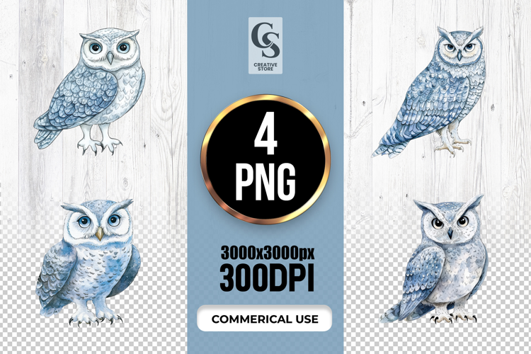 4 Watercolor Snowy Owl Clipart Sublimation PNG Files Perfect for Greeting Cards, Invitations, Junk Journal, Party Decor, Scrapbooking and many other craft projects.