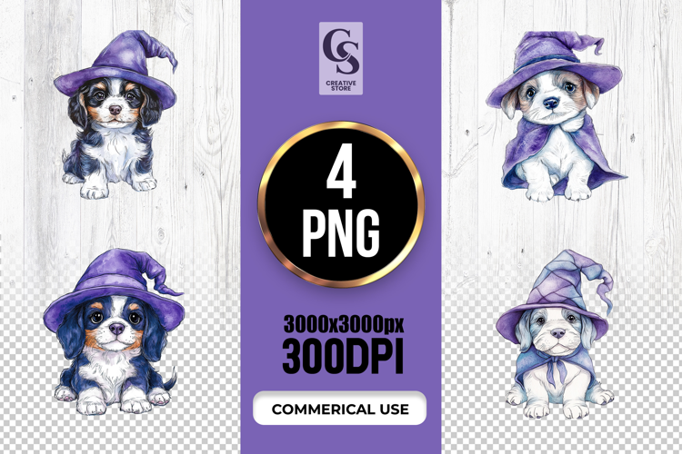 4 Wizard Puppy Clipart Sublimation PNG Files Perfect for Greeting Cards, Invitations, Junk Journal, Party Decor, Scrapbooking and many other craft projects.