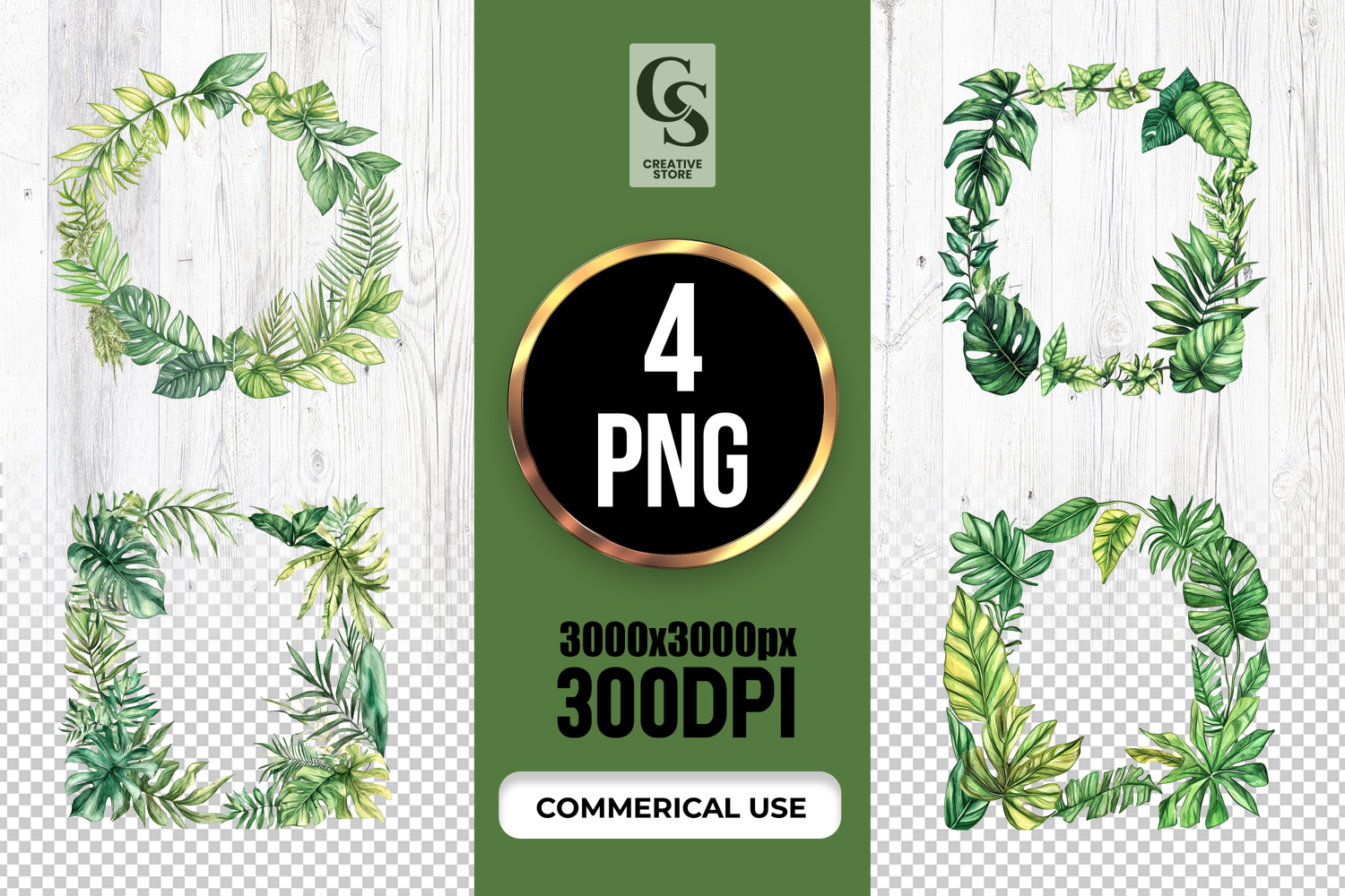 4 Watercolor Tropical Leaf Frame Clipart Sublimation PNG Files Perfect for Greeting Cards, Invitations, Junk Journal, Party Decor, Scrapbooking and many other craft projects.