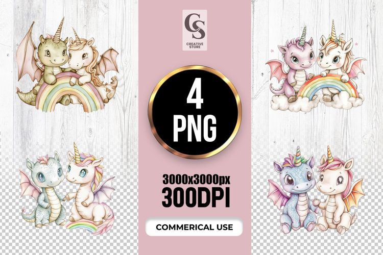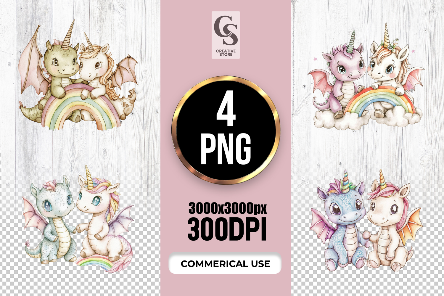 4 Rainbow Baby Dragon Unicorn Clipart Sublimation PNG Files Perfect for Greeting Cards, Invitations, Junk Journal, Party Decor, Scrapbooking and many other craft projects.