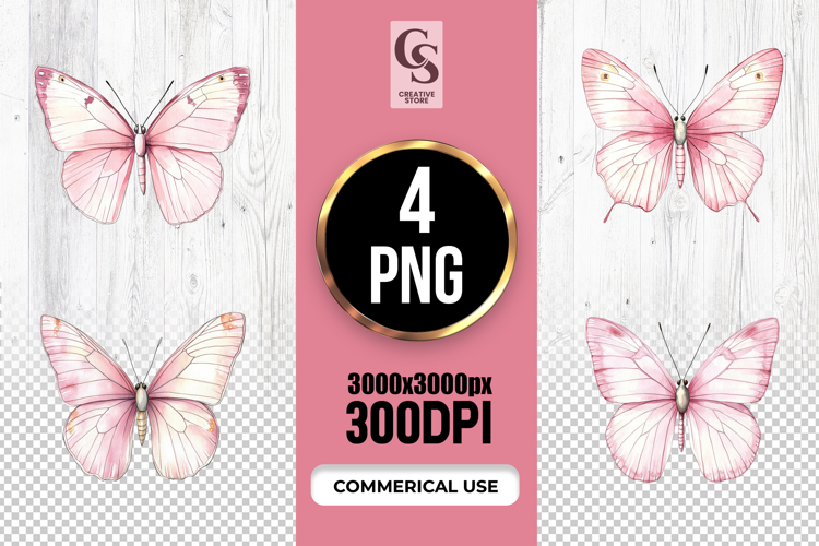 4 Pink Watercolor Butterfly Clipart Sublimation PNG Files Perfect for Greeting Cards, Invitations, Junk Journal, Party Decor, Scrapbooking and many other craft projects.