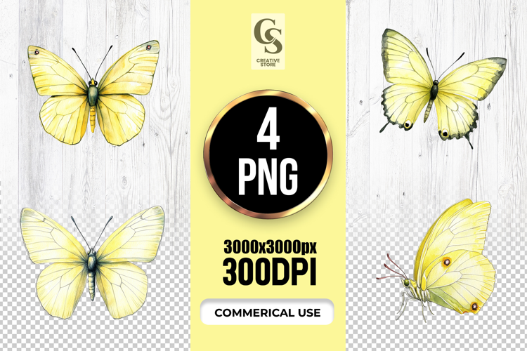 4 Yellow Watercolor Butterfly Clipart Sublimation PNG Files Perfect for Greeting Cards, Invitations, Junk Journal, Party Decor, Scrapbooking and many other craft projects.