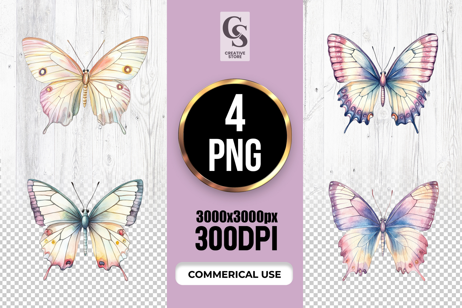 4 Delicate Watercolor Butterfly Clipart Sublimation PNG Files Perfect for Greeting Cards, Invitations, Junk Journal, Party Decor, Scrapbooking and many other craft projects.
