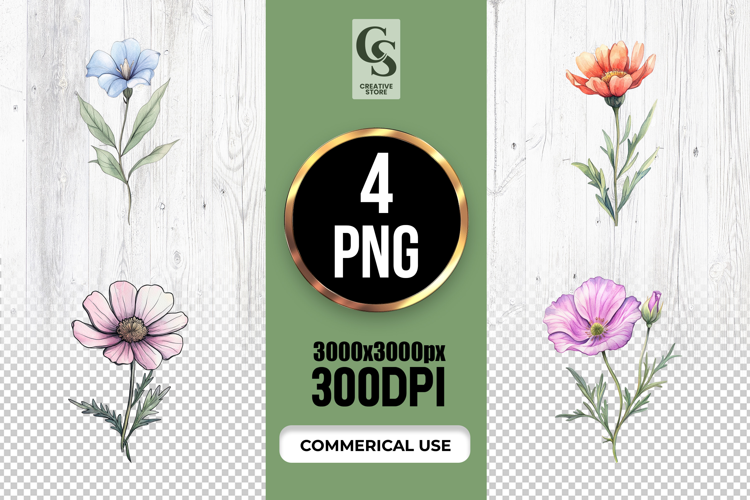 4 Watercolor Wildflower Clipart Sublimation PNG Files Perfect for Greeting Cards, Invitations, Junk Journal, Party Decor, Scrapbooking and many other craft projects.