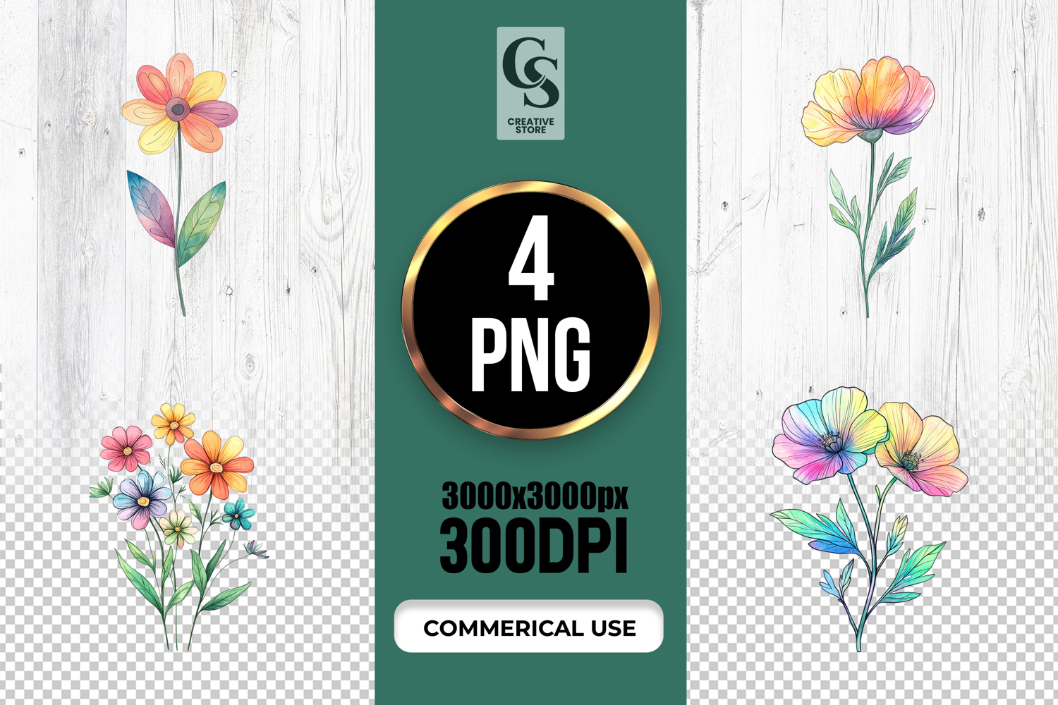 4 Watercolor Rainbow Flower Clipart Sublimation PNG Files Perfect for Greeting Cards, Invitations, Junk Journal, Party Decor, Scrapbooking and many other craft projects.