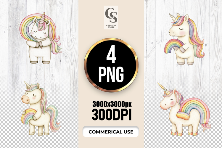 4 Watercolor Rainbow Unicorn Clipart Sublimation PNG Files Perfect for Greeting Cards, Invitations, Junk Journal, Party Decor, Scrapbooking and many other craft projects.