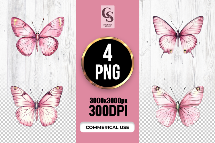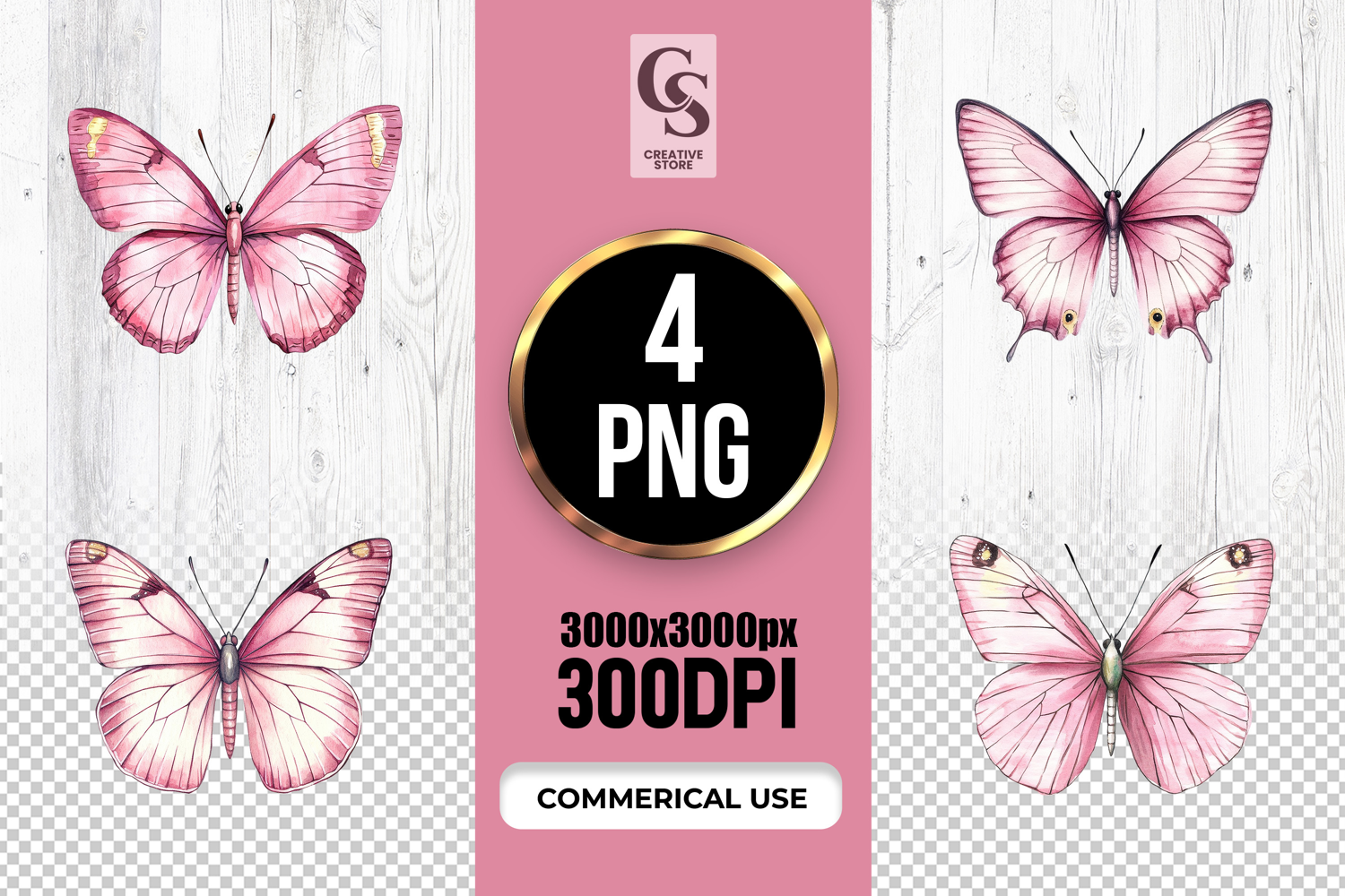 4 Pink Watercolor Butterfly Clipart Sublimation PNG Files Perfect for Greeting Cards, Invitations, Junk Journal, Party Decor, Scrapbooking and many other craft projects.
