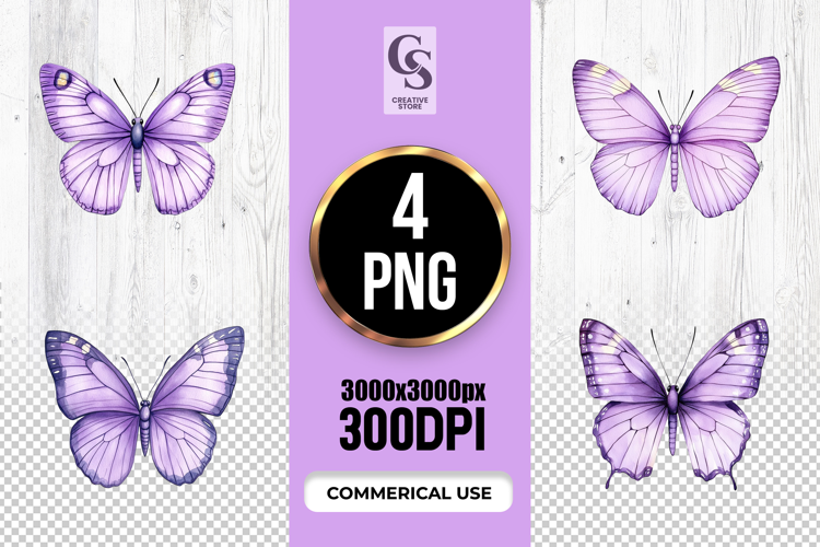 4 Purple Butterfly Watercolor Clipart Sublimation PNG Files Perfect for Greeting Cards, Invitations, Junk Journal, Party Decor, Scrapbooking and many other craft projects.