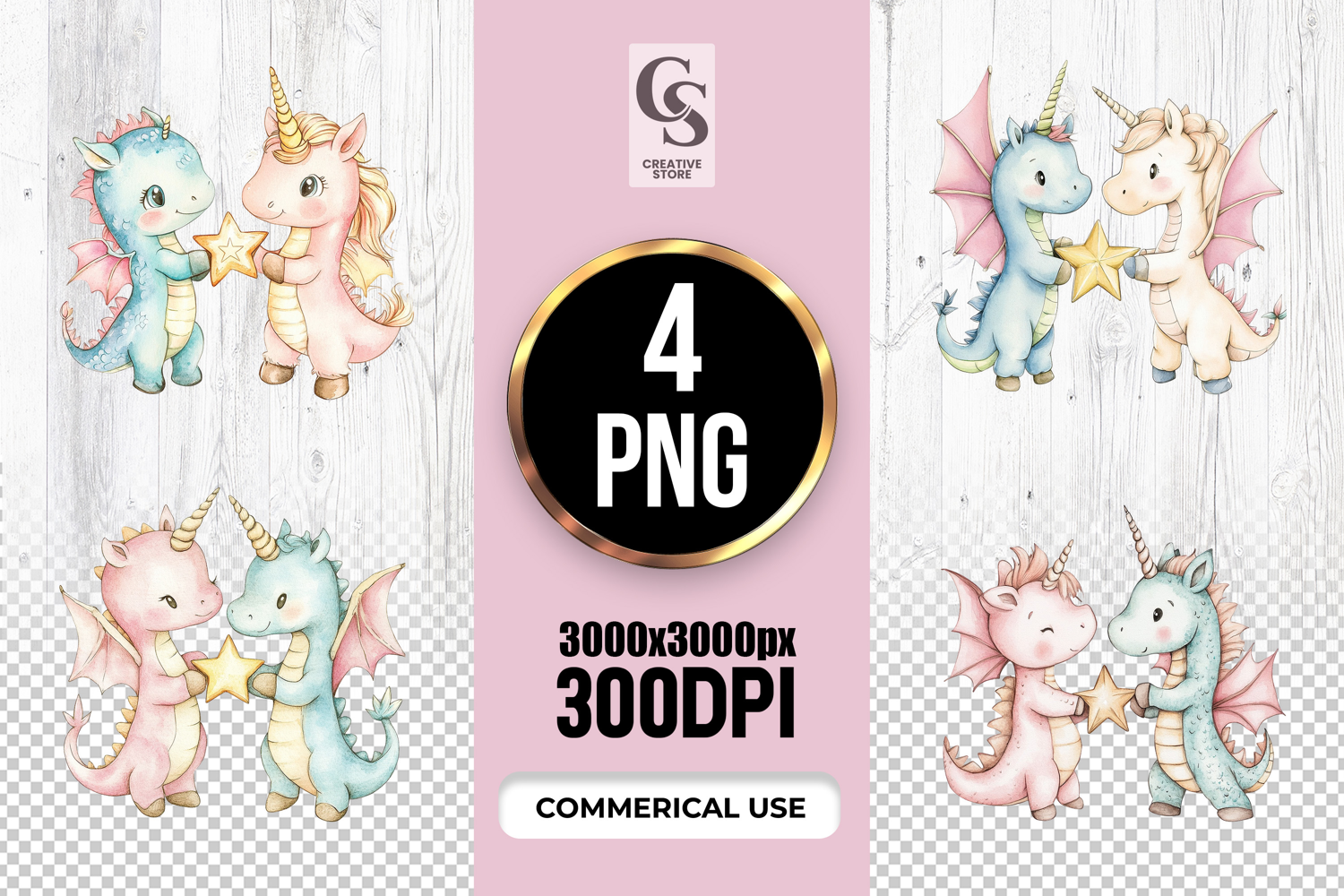 4 Cute Dragon Unicorn Star Clipart Sublimation PNG Files Perfect for Greeting Cards, Invitations, Junk Journal, Party Decor, Scrapbooking and many other craft projects.