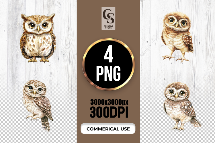 4 Cute Owl Watercolor Clipart Sublimation PNG Files Perfect for Greeting Cards, Invitations, Junk Journal, Party Decor, Scrapbooking and many other craft projects.