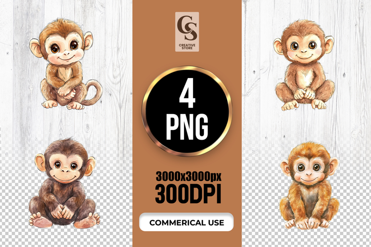 4 Cute Baby Monkey Watercolor Clipart Sublimation PNG Files Perfect for Greeting Cards, Invitations, Junk Journal, Party Decor, Scrapbooking and many other craft projects.