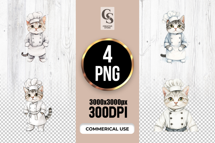 4 Watercolor Cute Chef Cat Clipart Sublimation PNG Files Perfect for Greeting Cards, Invitations, Junk Journal, Party Decor, Scrapbooking and many other craft projects.