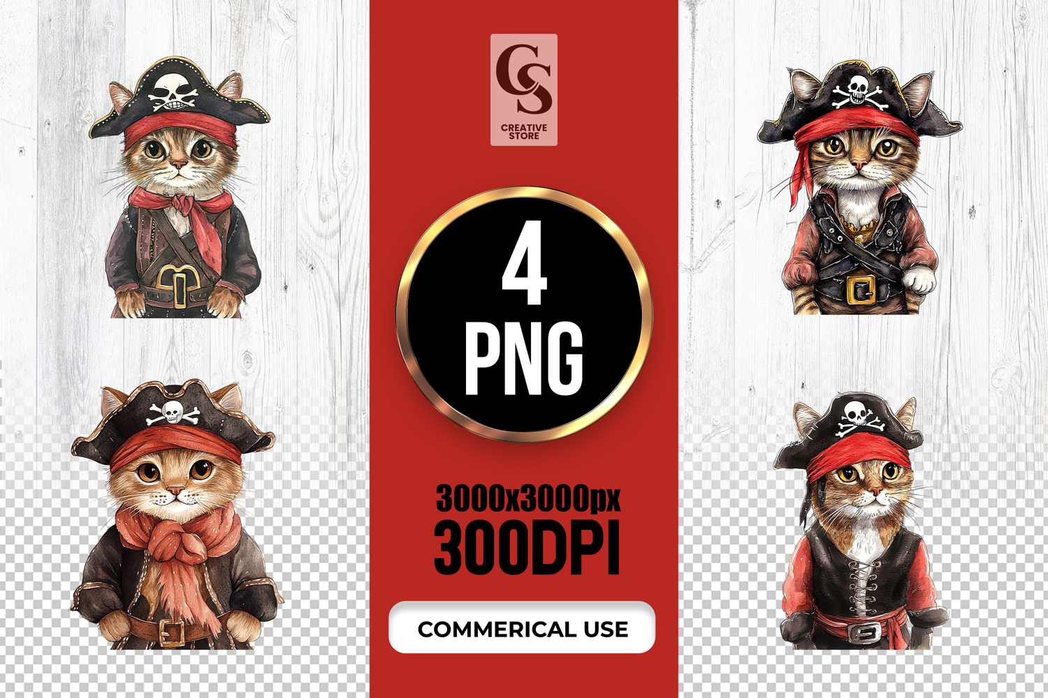 4 Watercolor Pirate Cat Clipart Sublimation PNG Files Perfect for Greeting Cards, Invitations, Junk Journal, Party Decor, Scrapbooking and many other craft projects .
