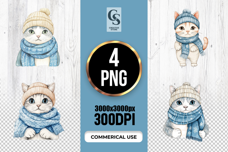 4 Watercolor Winter Cat Clipart Sublimation PNG Files Perfect for Greeting Cards, Invitations, Junk Journal, Party Decor, Scrapbooking and many other craft projects .