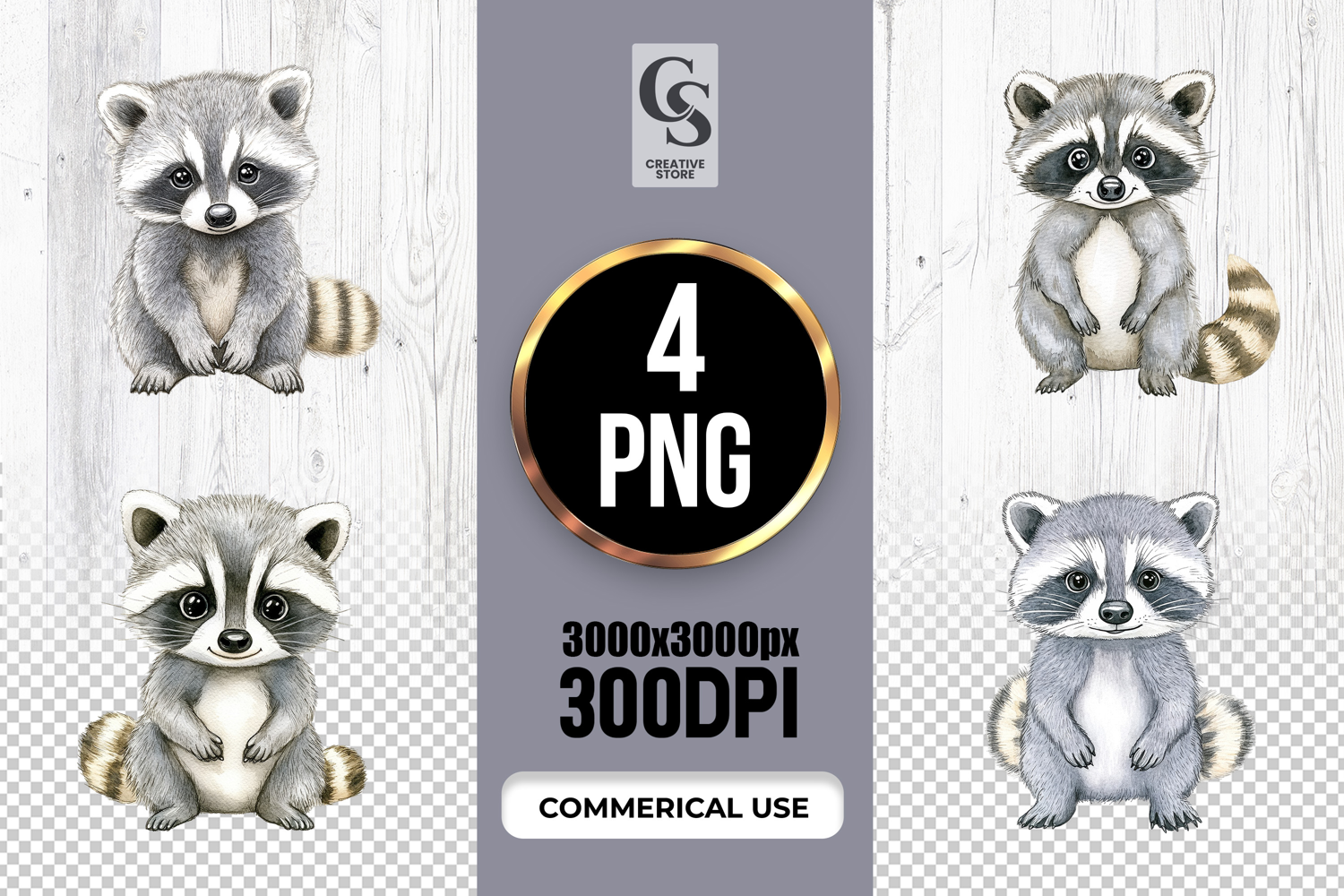 4 Cute Raccoon Watercolor Forest Animal Clipart PNG Files Perfect for Greeting Cards, Invitations, Junk Journal, Party Decor, Scrapbooking and many other craft projects .