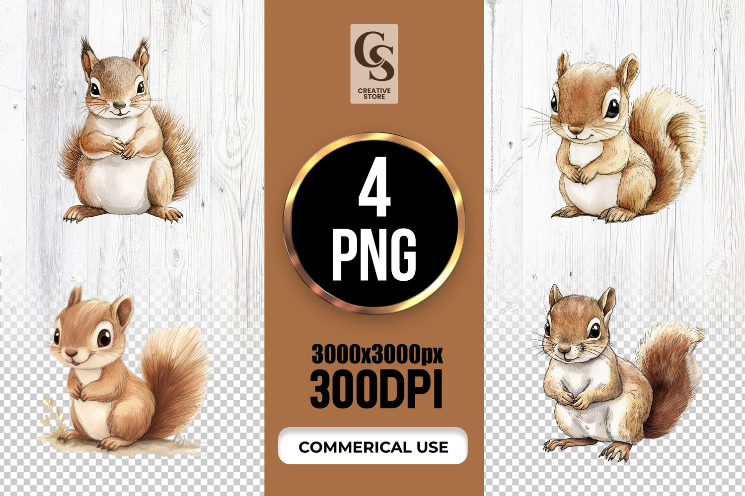 4 Cute Squirrel Watercolor Forest Animal Clipart PNG Files Perfect for Greeting Cards, Invitations, Junk Journal, Party Decor, Scrapbooking and many other craft projects .
