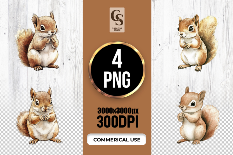 4 Watercolor Squirrel Forest Animal Clipart Sublimation PNG Files Perfect for Greeting Cards, Invitations, Junk Journal, Party Decor, Scrapbooking and many other craft projects .