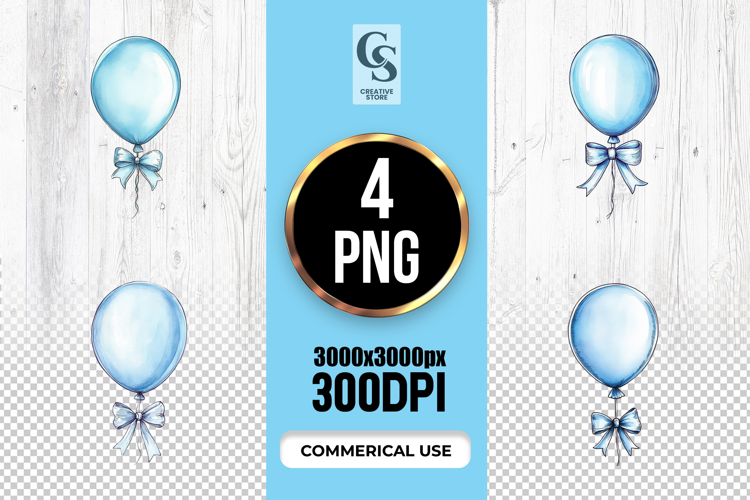 4 Blue Balloon with Bow Watercolor Clipart Sublimation PNG Files Perfect for Greeting Cards, Invitations, Junk Journal, Party Decor, Scrapbooking and many other craft projects .