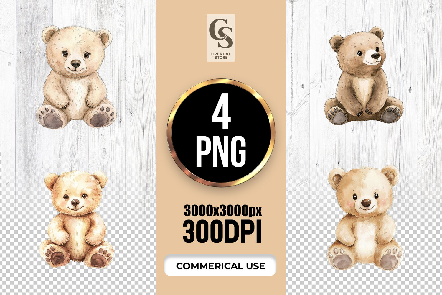 4 Cute Beige Teddy Bear Watercolor Clipart Sublimation PNG Files Perfect for Greeting Cards, Invitations, Junk Journal, Party Decor, Scrapbooking and many other craft projects .