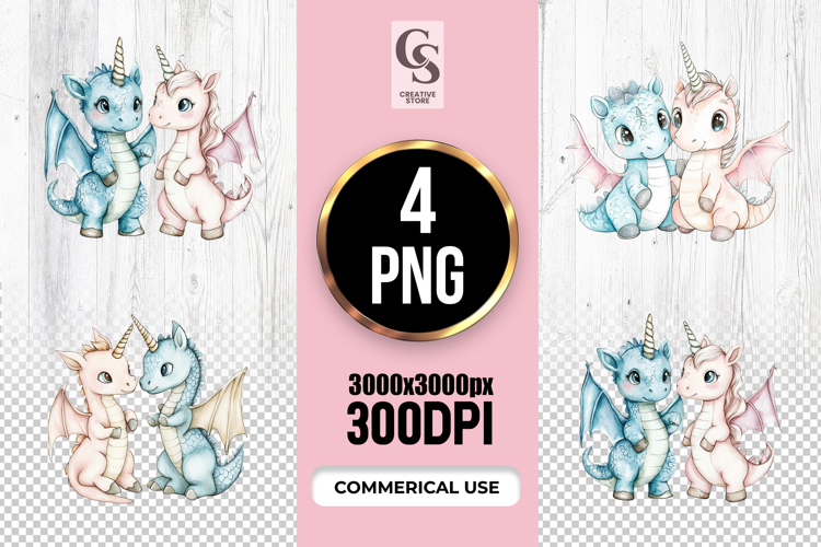 Cute Unicorn Dragon Couple Clipart Sublimation PNG example image 1
