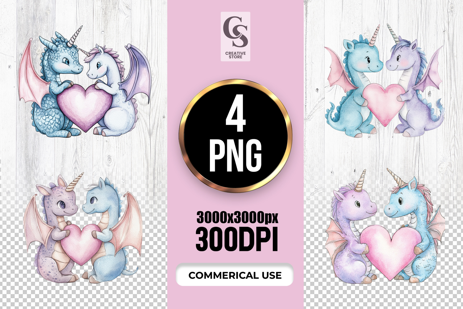 4 Cute Unicorn Dragon Heart Clipart Sublimation PNG Files Perfect for Greeting Cards, Invitations, Junk Journal, Party Decor, Scrapbooking and many other craft projects .