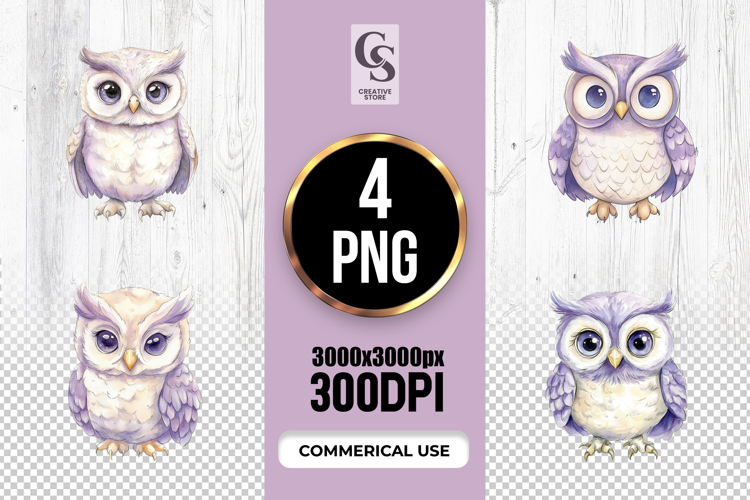 4 Cute Lavender Owl Watercolor Clipart Sublimation PNG Files Perfect for Greeting Cards, Invitations, Junk Journal, Party Decor, Scrapbooking and many other craft projects .