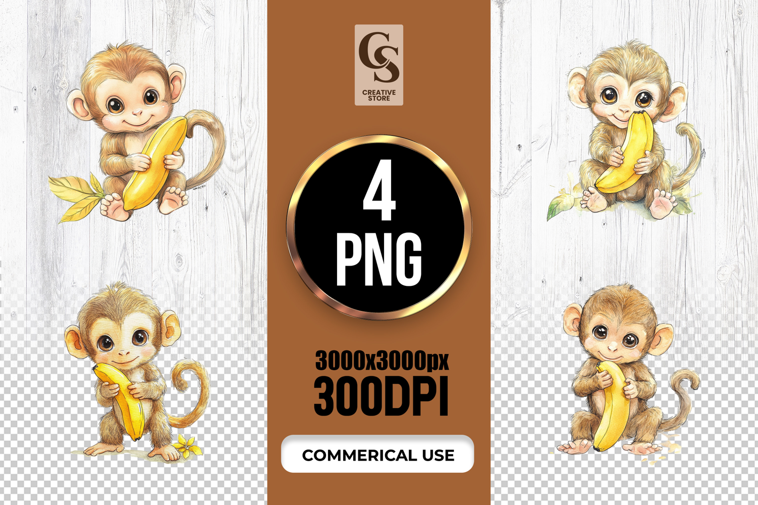 4 Cute Baby Monkey Watercolor Clipart Sublimation PNG Files Perfect for Greeting Cards, Invitations, Junk Journal, Party Decor, Scrapbooking and many other craft projects .