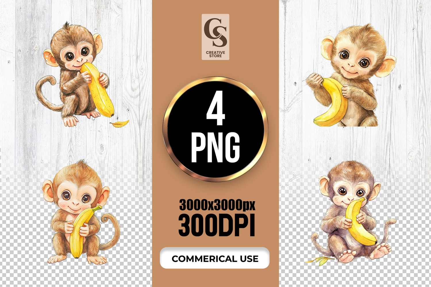 4 Cute Monkey With Banana Clipart Sublimation PNG Files Perfect for Greeting Cards, Invitations, Junk Journal, Party Decor, Scrapbooking and many other craft projects .