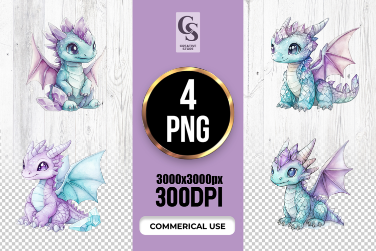 4 Cute Crystal Baby Dragon Watercolor Clipart Sublimation PNG Files Perfect for Greeting Cards, Invitations, Junk Journal, Party Decor, Scrapbooking and many other craft projects .