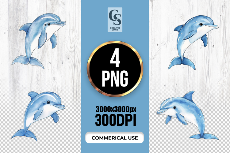 4 Cute Blue Dolphin Watercolor Clipart Sublimation PNG Files Perfect for Greeting Cards, Invitations, Junk Journal, Party Decor, Scrapbooking and many other craft projects .