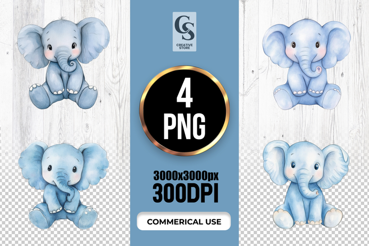4 Cute Blue Baby Elephant Watercolor Clipart Sublimation PNG Files Perfect for Greeting Cards, Invitations, Junk Journal, Party Decor, Scrapbooking and many other craft projects .