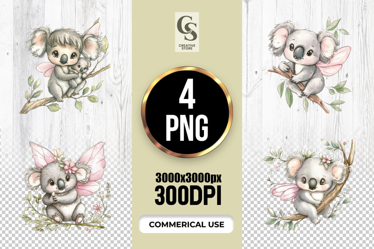 4 Cute Fairy Koala Watercolor Clipart Sublimation PNG Files Perfect for Greeting Cards, Invitations, Junk Journal, Party Decor, Scrapbooking and many other craft projects .