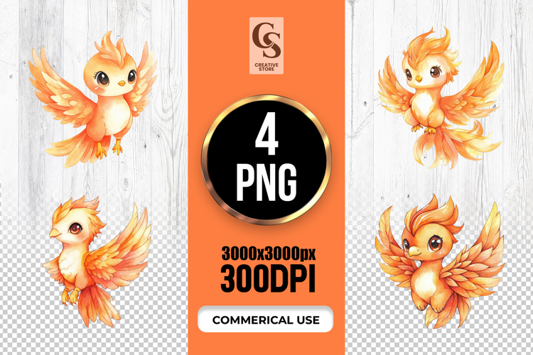 4 Cute Fire Phoenix Watercolor Clipart Sublimation PNG Files Perfect for Greeting Cards, Invitations, Junk Journal, Party Decor, Scrapbooking and many other craft projects .